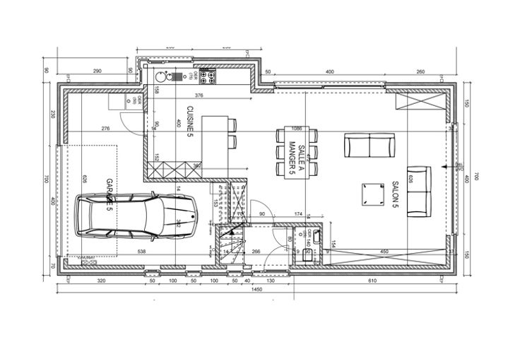 Rez-de-chaussée : hall d'entrée, WC séparé avec lave-mains, séjour avec cuisine équipée ouverte, garage avec coin buanderie, place de parking, fondation de terrasse prête et jardin non engazonné