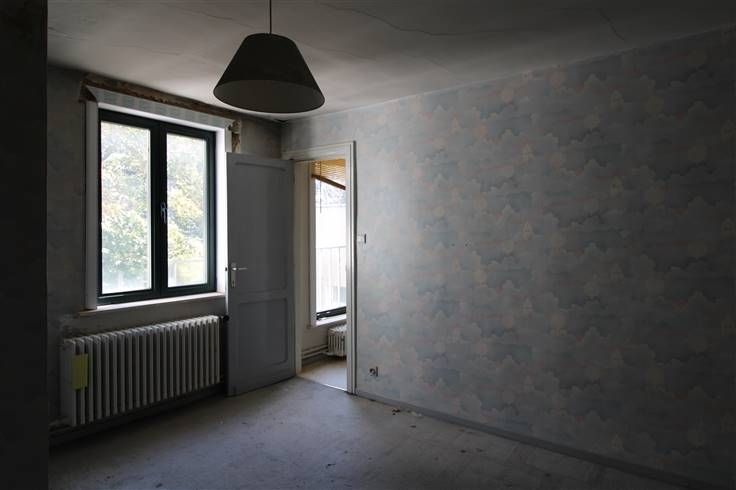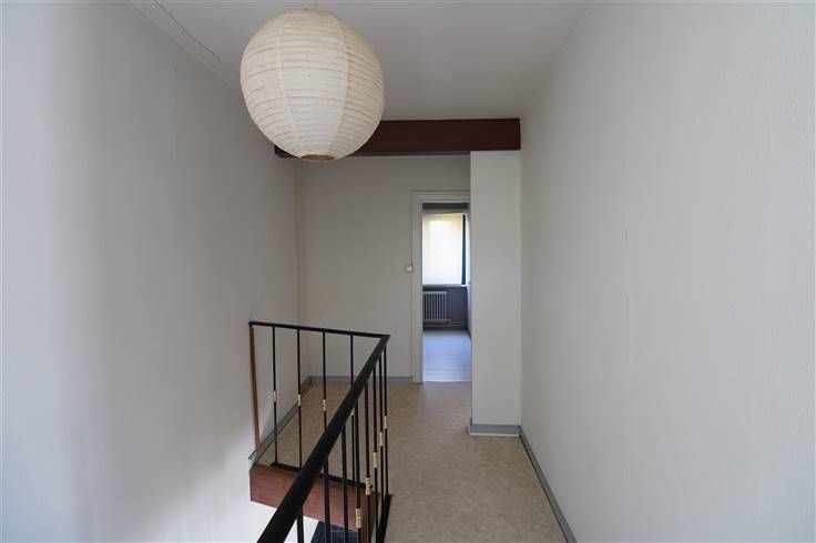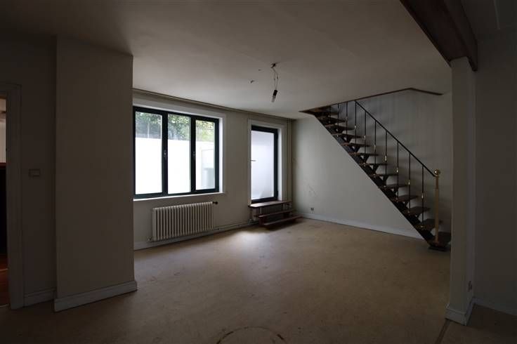 Op de eerste verdieping bevindt zich een toilet, een opslagplaats en het woongedeelte. Het woongedeelte bestaat uit een inkomhal, een gedeeltelijk geïnstalleerde keuken, een lichtrijke woon -en eetkamer, een berging en een toilet. Via de woonkamer is er toegang tot het dakterras. Tot slot situeren zich op de derde verdieping twee slaapkamers en een badkamer.