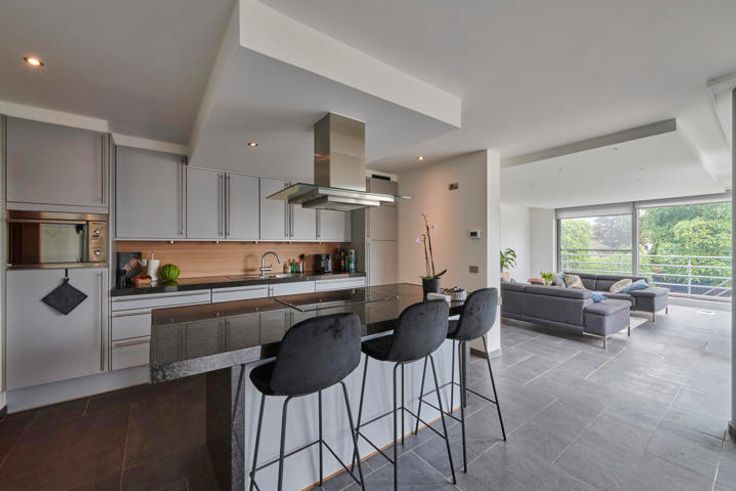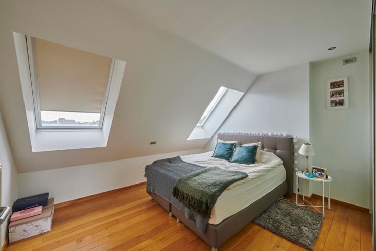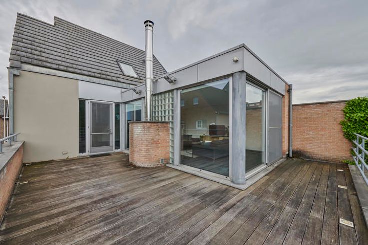 Het bovenliggend appartement met 3 slaapkamers (bruikbare vloeroppervlakte 152m²) is als volgt opgebouwd: op de eerste verdieping bevinden zich de inkom/overloop, badkamer, gastentoilet, open leefruimte met inbouwhaard (keuken, eethoek, zitkamer) en een ruim terras. Op de tweede verdieping vinden we de nachthal, 3 slaapkamers en een toilet.