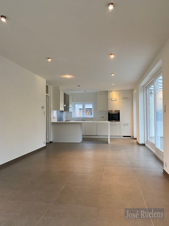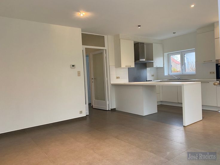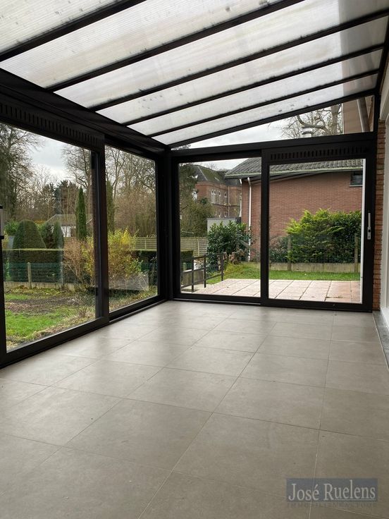 De woning bestaat gelijkvloers uit een aangename inkom, een lichtrijke woonkamer met volledig, open geïnstalleerde keuken en aansluitend een leuke zomerveranda.