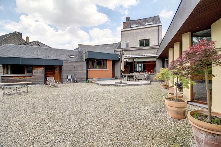 Spacieuse habitation avec bureaux/atelier, garage et jardin. L'habitation se compose d'un hall d'entrée avec wc, d'un living de +/- 45m², et d'une cuisine contemporaine totalement équipée. L'espace parental du rez comprend la chambre, la salle de bain et le dressing. Au 1er, 2 chambres, salle de bain et wc. Et enfin une chambre de +/- 45m² aménagée au second. Un garage (avec espace buanderie) de + de 60m². Les bureaux/atelier composés d'un hall d'entrée, de plusieurs bureaux, kitchenette, wc, chaufferie et d'une vaste pièce de rangement offrent une superficie de +/- 215m². L'ensemble donnant sur un grand jardin calme et ensoleillé.