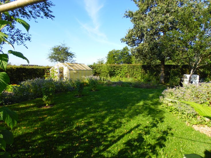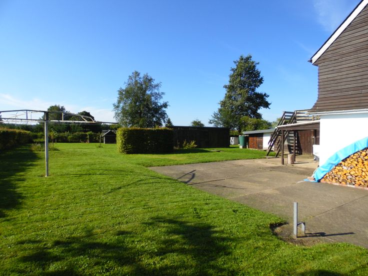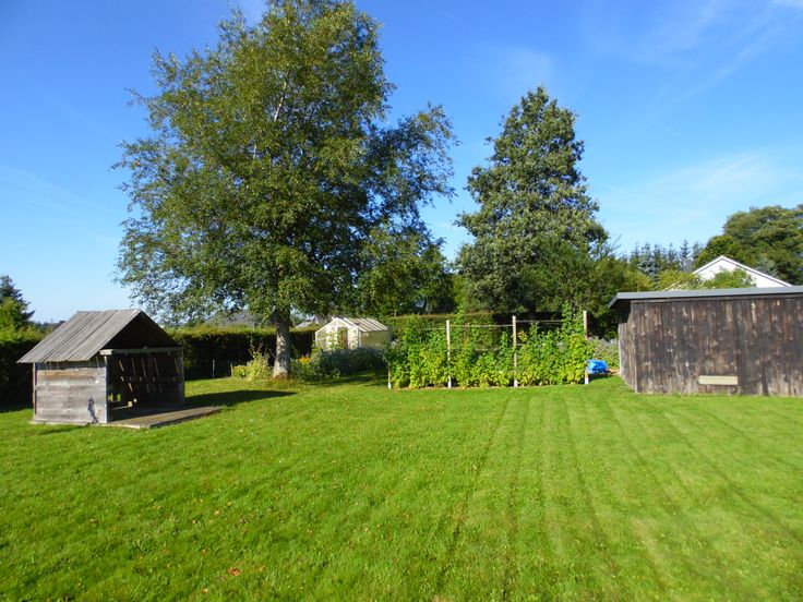 Terras op 1e verdieping (WE2), kippenstal, garage, vaste wasspin, schuurtje, jonge fruitbomen e.d.. Perceel met heggen, draad en grote poort afgesloten.