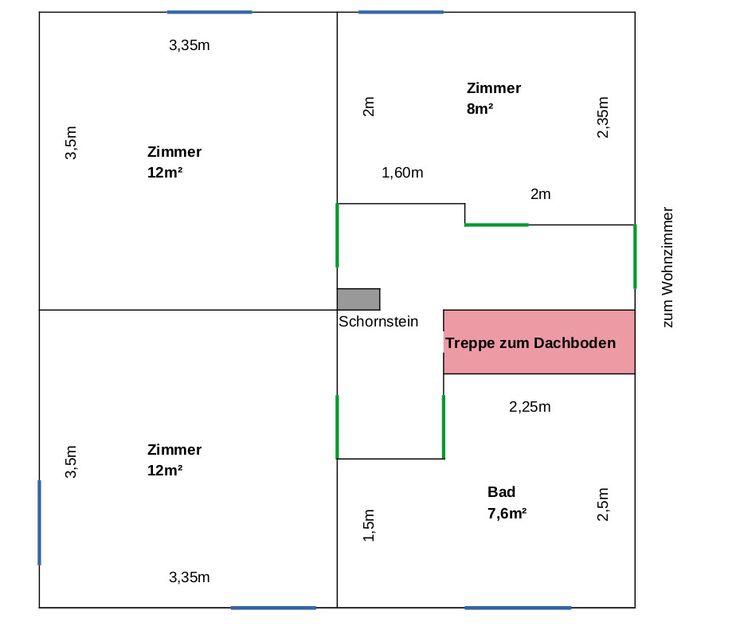 WE2 (groot): Gelijkvloers, 1. etage, zolder. Ruimtes (voornamelijk op 1. etage): woonkamer (34m²), keuken (12m²), badkamer (met toilet) (7,6m²), 3 slaapkamers (12, 12, 8m²), wasruimte (gelijkvloers) (19m²), ruimte met mazouttank (gelijkvloers) (18m²), zolder: vaste trap, in 2 gedeeld: +/- 20m² bewoonbaar, rest bergzolder (+/- even groot).