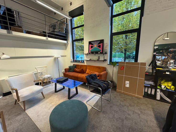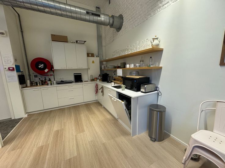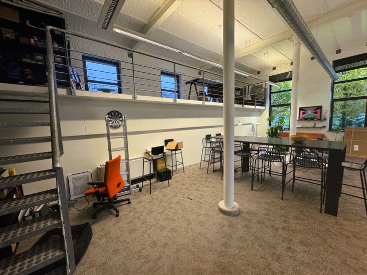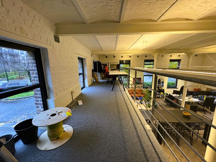 Au rez-de-chaussée droit, 1 surface de bureau de 188 m² incluant 1 espace mezzanine, 1 cuisine équipée séparée avec table à déjeuner, 1 bureau séparé.
