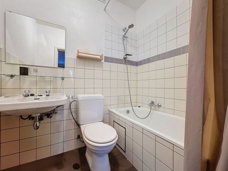 Dès l’entrée, vous trouverez le coin cuisine avec taques électrique, hotte et évier. La pièce de vie principale bénéficie de beaucoup de lumière grâce à la baie vitrée qui donne sur la terrasse. Une salle de bains équipée d’un lavabo simple, d’une baignoire et d’un WC complète le logement.