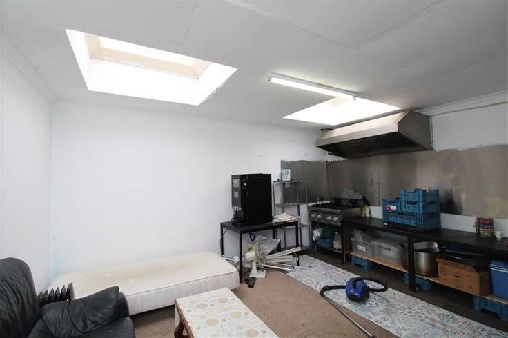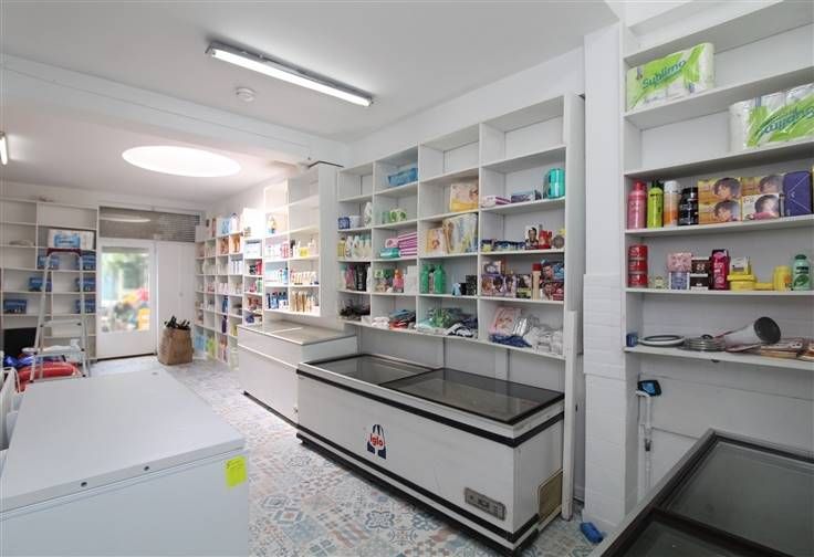 winkelruimte (ca. 4,67 x 4,95) + bergplaats aan de voorzijde, doorgang met kleed- en wasplaats, aparte wc en kamer met diepvriesinstallatie & aan de achterzijde de werktafels + afwas- en kookhoek.