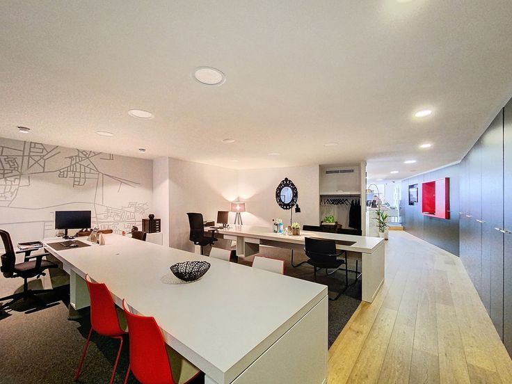Indeling: Inkom met balie en zitbank, ruime kantoorruimte met tientallen ingebouwde kasten, kleine kitchenette en 2 vaste bureaus voor minimum 4 personen, vergaderzaal of apart kantoor, apart toilet met handenwasser, achteringang met waskamer, inpandige garage met achteringang en automatische poort.
