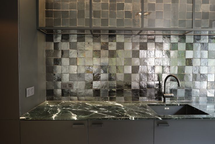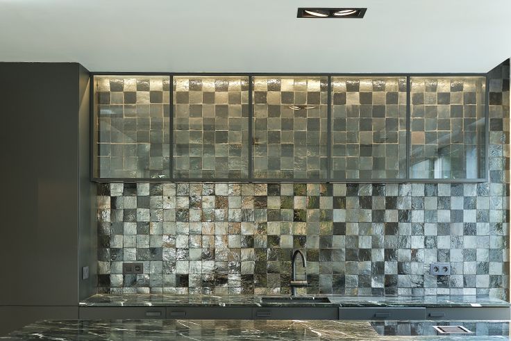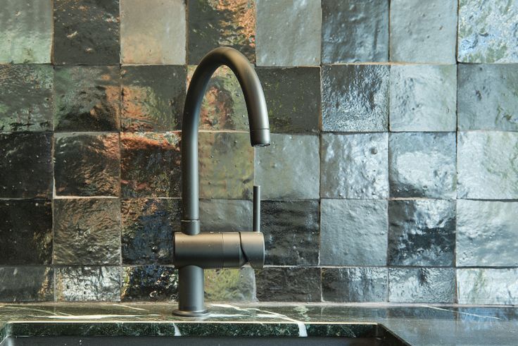 Eyecatcher in de leefruimte van 38 m2 is het keukeneiland met marmeren blad van 1 op 3 meter waar je comfortabel met vijf kan aanschuiven, een werkblad uit dezelfde plaat en de betegelde muur en op maat gemaakte lichtbak.