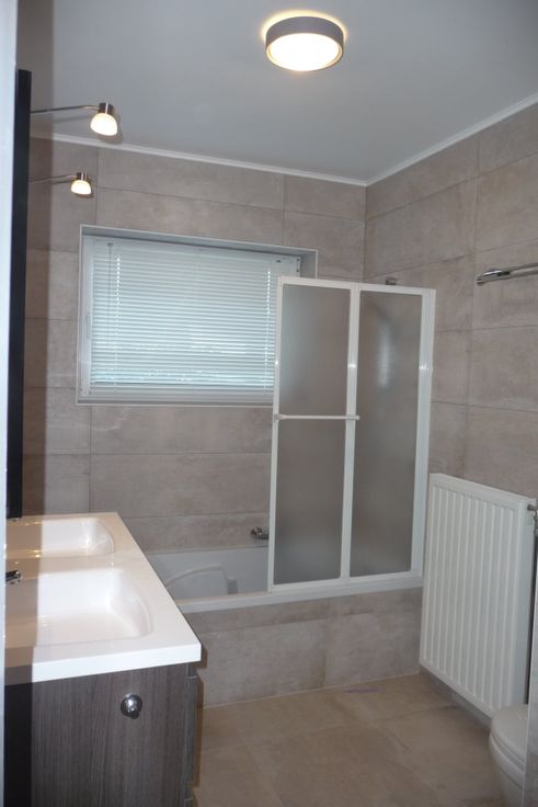 1 salle de bain récente, tout à neuf : carrelages, meuble SDB 120cm avec pharmacie, baignoire avec accoudoirs et WC suspendu : belles finitions