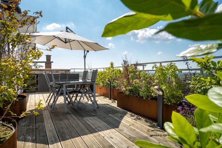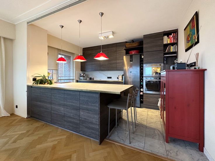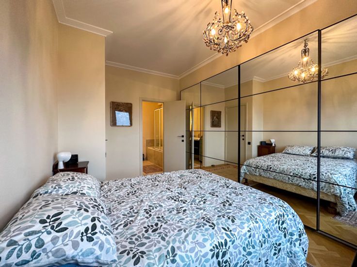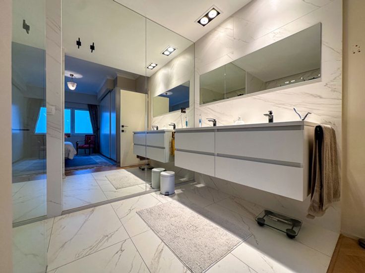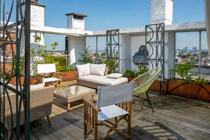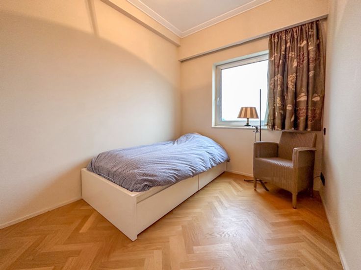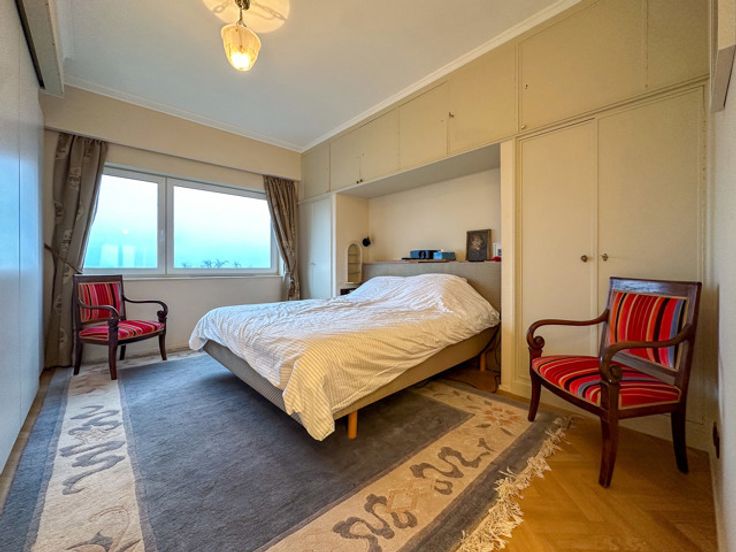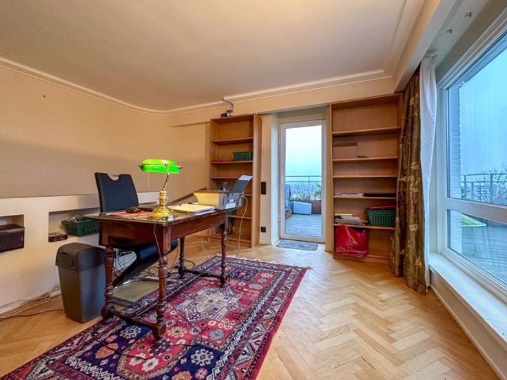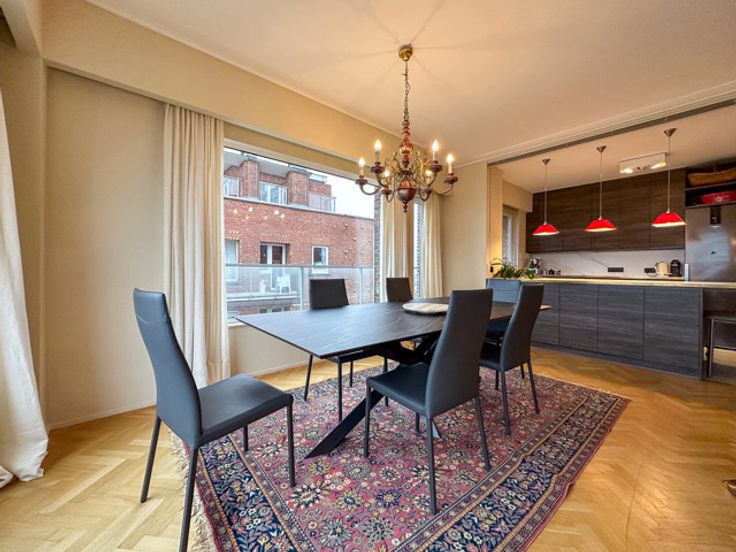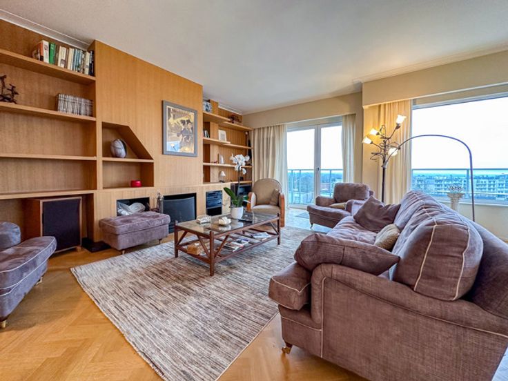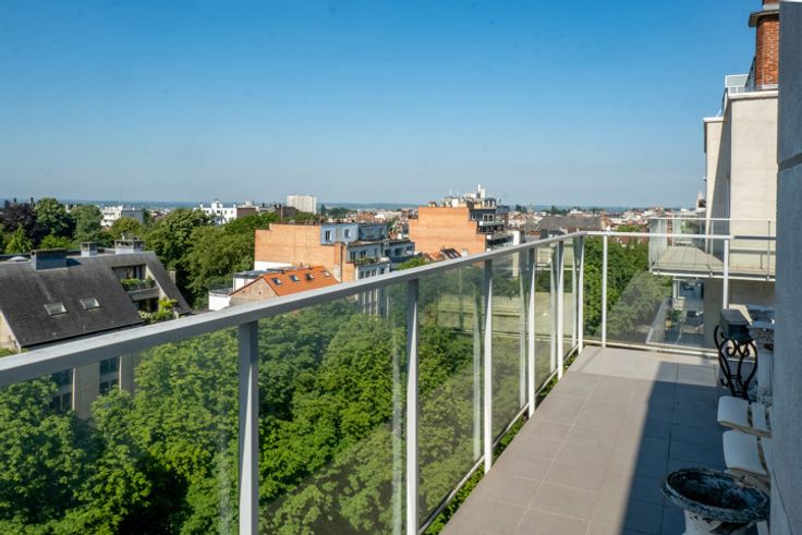 UKKEL - Op de prestigieuze Churchilllaan, dichtbij het Brugmannplein, een lumineus penthouse APPARTEMENT (3bed/ 1bad/1douche) met dakterras. Gelegen op de 9de en bovenste verdieping, bestaat het uit een inkomhal, 50m² woonkamer met decoratieve open haard, bibliotheek en open ingerichte keuken met centraal eiland, nachthal met gastentoilet, wasruimte, 16m² grote slaapkamer met inbouwkasten en en suite douchekamer, 15m² slaapkamer met inbouwkasten, en suite badkamer, 8m² slaapkamer/kantoor. In de duplex geeft een open kantoorruimte van 14m² uit op een weelderig terras van 60m² op het zuiden. Veel bergruimte.  Optionele garageplaats +150€/maand. Voorzieningen voor lasten: 320€/maand (gemeenten, verwarming, warm water). EPC G. Te ontdekken bij L&P!