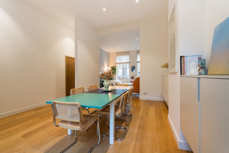 ELSENE, Wijk van de Vijvers van Elsene: APPARTEMENT in een klein gebouw met 4 eenheden. Dit prachtige duplex van 154m², volledig gerenoveerd in 2018, combineert charme en modern comfort. Gelegen op slechts 600 meter van de Abbaye de la Cambre en in de nabijheid van de Étangs d’Ixelles, heeft het een gastvrije sfeer binnen het gebouw. Het bovenste niveau biedt een ruime woonkamer die baadt in het licht dankzij de westelijke oriëntatie, met een woonkamer, een eetkamer met toegang tot een terras, en een volledig uitgeruste keuken, alles verhoogd door een plafondhoogte van 3,5 meter. Op het lagere niveau vindt u een 17m² master bedroom met een geïntegreerde 14m² kleedkamer en een aangrenzende badkamer (douche, bad, dubbele wastafel). De slaapkamer biedt ook toegang tot een privé binnenplaats van 8m². Een 6m² kantoor, momenteel gebruikt als kinderkamer, en een apart toilet maken deze verdieping compleet. Een onafhankelijke kamer van 12m², gelegen op de entresol (niet verbonden met het appartement in de huidige staat), is momenteel ingericht als studio, wat een interessante mogelijkheid biedt. Een privé kelder is inbegrepen, en de kelderhal is ingericht als een gemeenschappelijke ruimte voor fietsen en kinderwagens. PEB D. Individuele gasboiler. Elektriciteit conform. Exclusief te bezichtigen via LATOUR&PETIT!