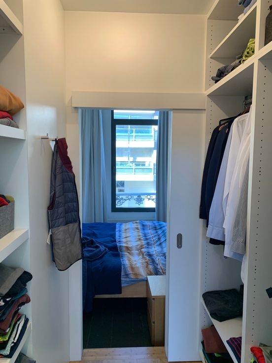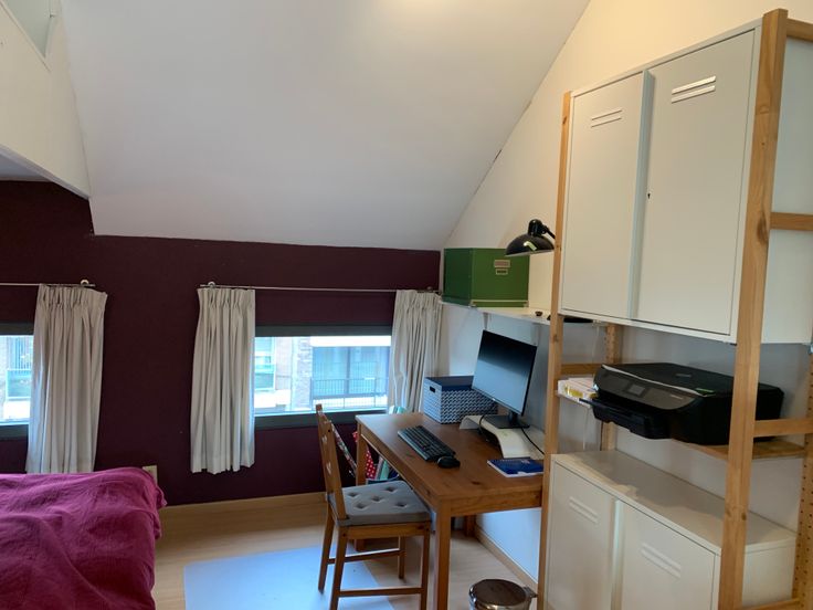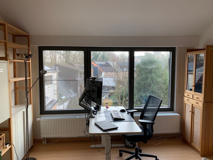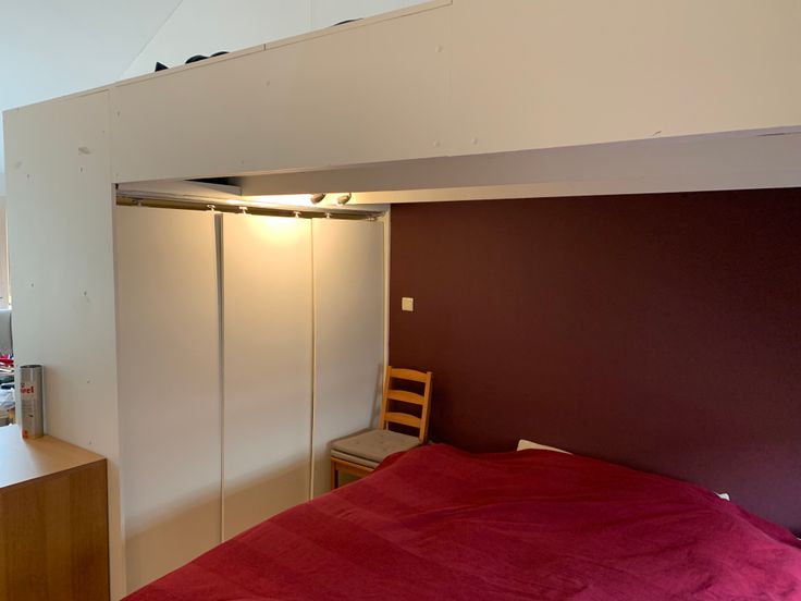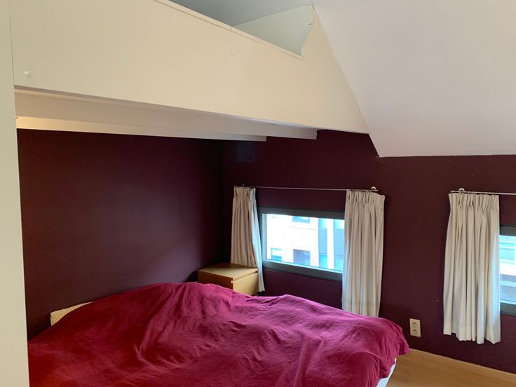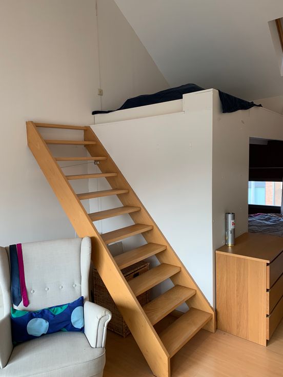 Gaan we verder naar de 2de verdieping, komen we boven in een grote ruimte die dienst kan doen als slaapkamer met groot bureel of speelruimte. Door het grote raam komt er veel licht binnen en heb je een mooi zicht op de omgeving. De ruimte wordt opgedeeld door een hoogslaper met daaronder ingemaakte kastruimte.