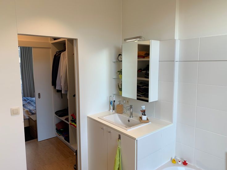 Nemen we de trap naar de eerste verdieping komen we boven in de hal de ingemaakte kasten tegen. Hier bevindt zich ook het aparte toilet. Daarnaast vinden we hier de badkamer die is voorzien van lavabo, ligbad, grote inloopdouche en inmaakkast voor wasmachine en droogkast. Een doorloopdressing verbindt de badkamer met de ruime slaapkamer.