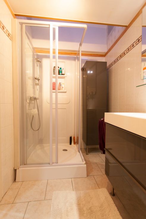 A l'étage, un salon et salle à manger, une cuisine équipée, (four, plaque vitro-céramique, frigo) Salle de douche meublée avec W-C et évier.