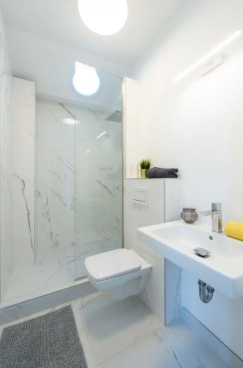 • Salle de bain : Avec une douche à l'italienne, un lavabo moderne, WC suspendus, machine à laver et un miroir.