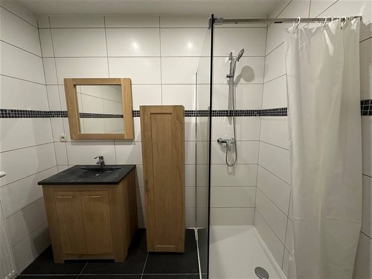 Het bestaat uit: een hal die leidt naar een bijkeuken, een eerste slaapkamer en een volledig uitgeruste doucheruimte (WC, douche en 1 wastafel + spiegel en kast), een woonkamer met een volledig uitgeruste keuken (kookplaat, afzuigkap, oven, gootsteen, koelkast + vriezer en kasten) en een tweede slaapkamer.