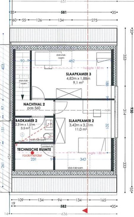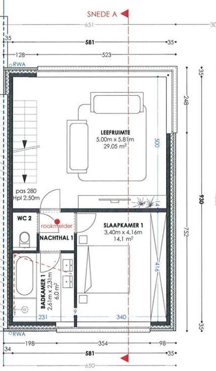 Tweede verdieping: twee ruime slaapkamers, badkamer met douche/WC en een bergruimte.