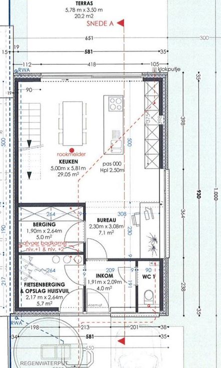 Op het gelijkvloers: inkom, ruimte voor fietsen, aparte berging, WC, ruime eetkamer/keuken met bureauruimte