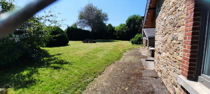 Jardin, cour en gravier avec deux places de parquage, cuisine équipée, buanderie, feu à bois...