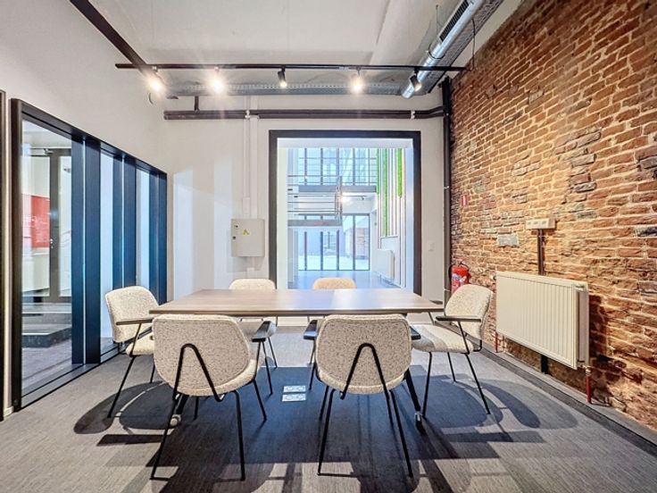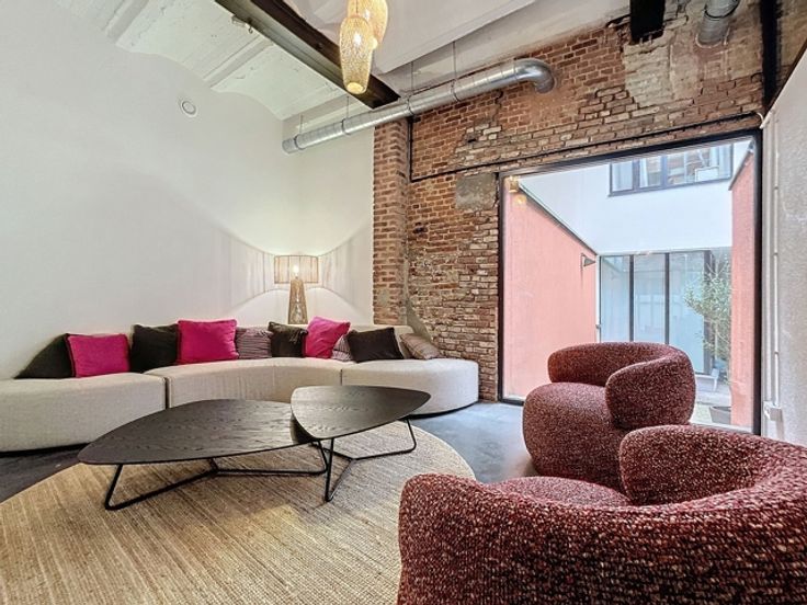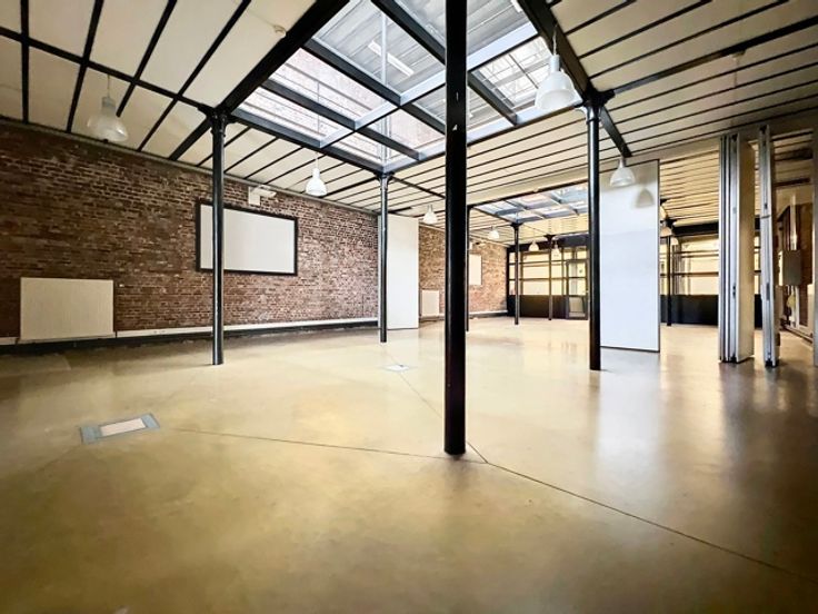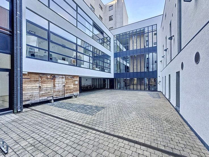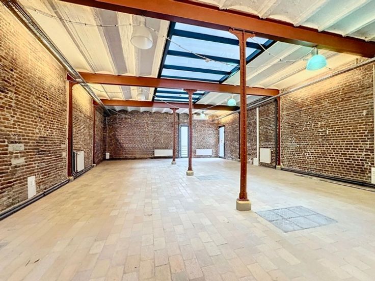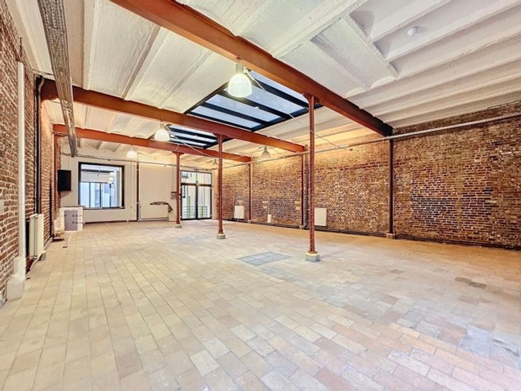 Atypisch en karaktervol kantoor van 106m² met hoge plafonds en zeer lichtinval gelegen op de begane grond van een 3-niveau "kantoor" gebouw maar binnen een gemengd complex (residentieel/kantoren/retail)
