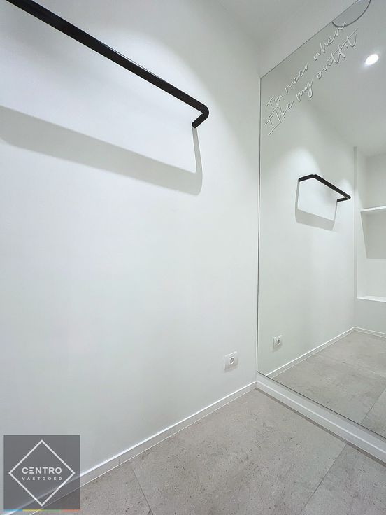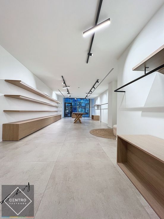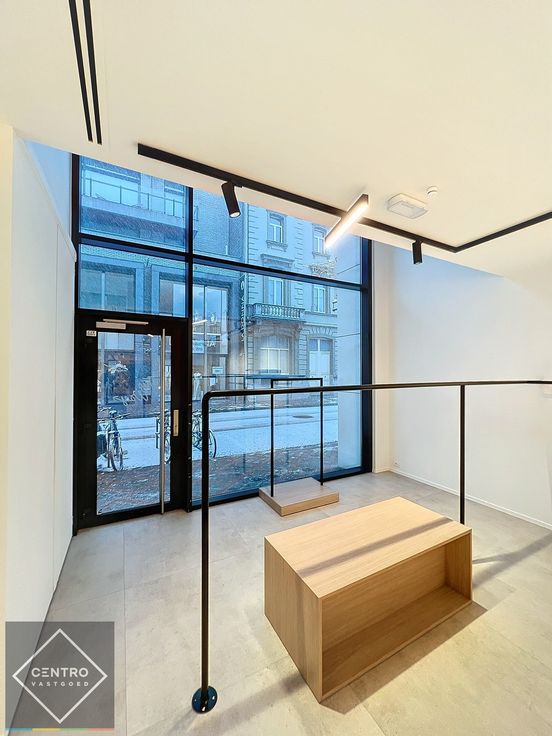 Gelijkvloers: volledig ingerichte winkel/handelsruimte - 4m etalage - volledig vernieuwd in 2022 - grootformaat tegels beige 1x1m - veel maatwerk (hangsystemen voor kapstokken, grote staande spiegel, houten tafel, legplanken, zitbanken,...) - high-end verlichting - 2 paskotjes met spiegel - camerabewaking.