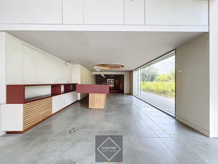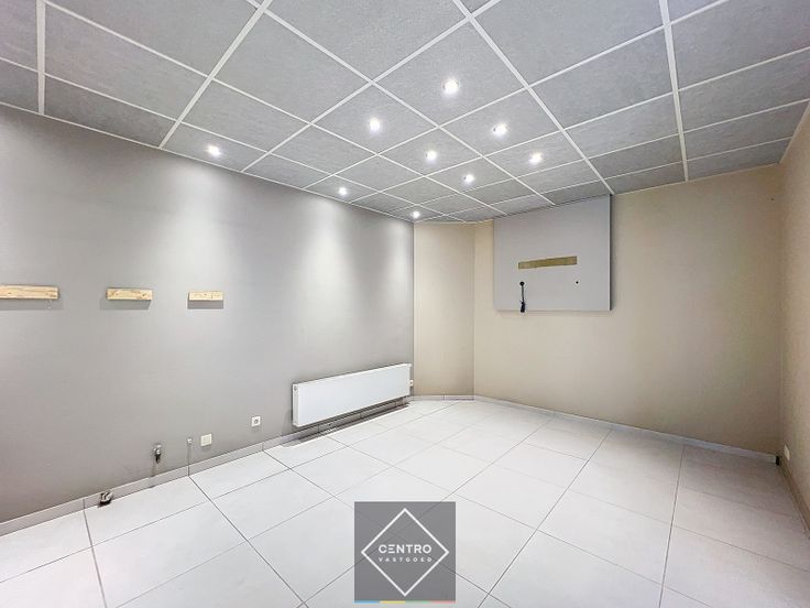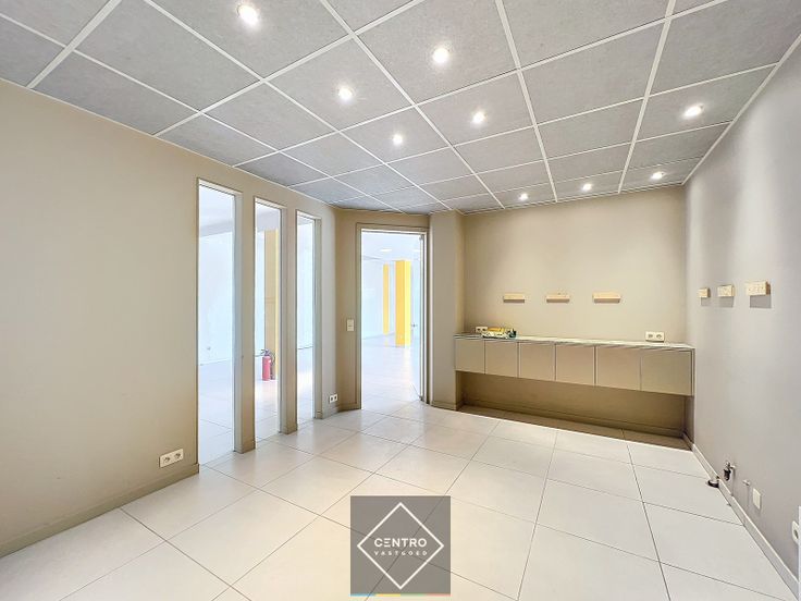 Automatische schuifdeur aan straatzijde (badge-systeem) - tweede ingangsdeur aan de zijkant - polybeton - parket - keramische tegels - tegelplafonds - halogeenlampen - de multifunctionele ruimte achteraan is afsluitbaar van de toonzaal met een rolpoort.