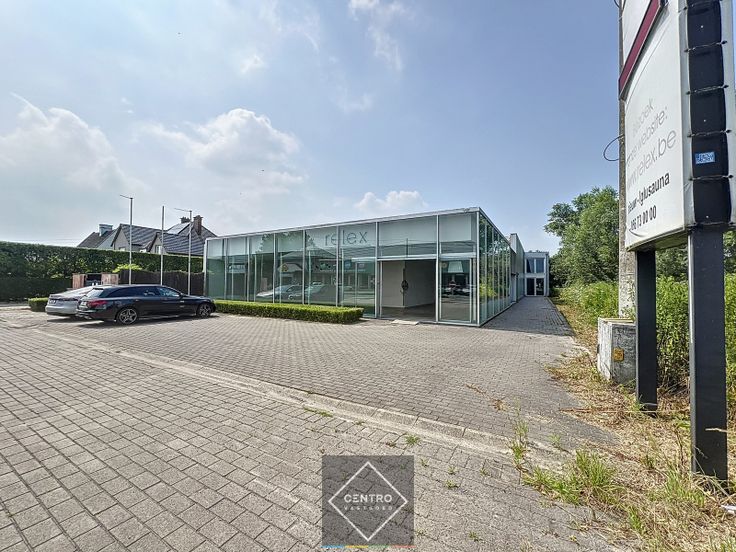 Toonzaal met façade van 17m breedte - ontvangstbalie - showroom - multifunctionele ruimte (met tweede aparte ingang) met geïntegreerd bureel (maatkast) en bar (spoelbak, vaatwas, inbouwfrigo's) - toilet - parkeergelegenheid op eigen terrein voor de toonzaal - grote reclametotem.
