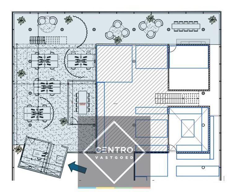 Bereikbaar via interne brede metalen trap - uitgeruste keuken met o.a. vaatwasmachine / serverlokaal - doucheruimte - vergaderzaal.
