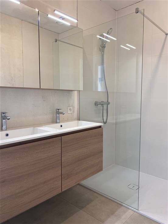 Het appartement bevat een inkomhal met glazen deur die leidt naar de leefruimte. Dankzij de grote raampartijen en de zuidelijke oriëntatie geniet je hier steeds van veel natuurlijk lichtinval. De open keuken is modern ingericht met de nodige toestellen. Verder is er een badkamer met inloopdouche en dubbel lavabomeubel aanwezig alsook een apart toilet. De 2 slaapkamers zijn achteraan het appartement gelegen.Er is ook een berging én wasruimte aanwezig.