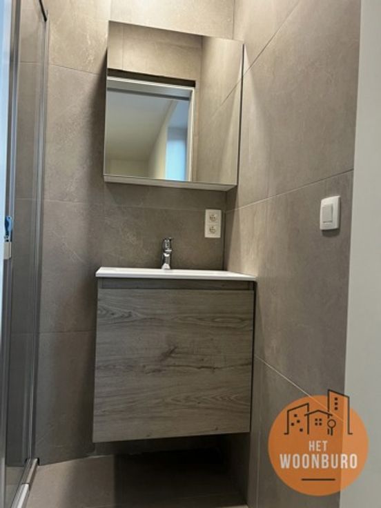 Prachtig nieuwbouw appartement omvattende: hall, WC, ruime berging, living, volledig ingerichte keuken (kasten, dampkap, kookplaat, oven, vaatwas, koelkast met vriesvak), badkamer met lavabo en inloopdouche, 1 slaapkamer en terras.