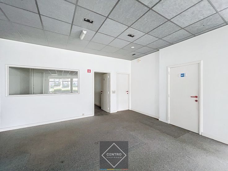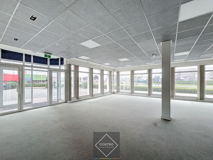 Private Inkomhal met sas - open commerciële ruimte met glaspartijen langs twee straten - apart bureel - keuken - sanitair.