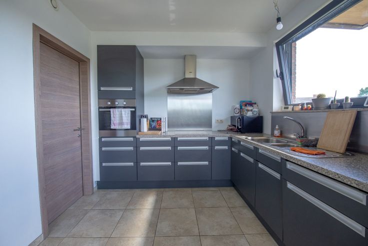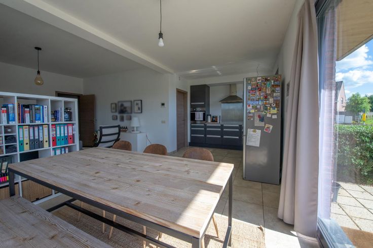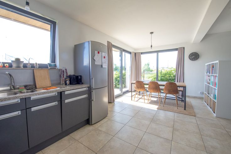 Indeling: inkom met toegang tot apart gastentoilet. Als we doorlopen komen we in de ruime leefruimte met open keuken terecht. De keuken is praktisch ingericht en uitgerust met alle comfort (kookplaat, frigo, oven, vaatwas, dampkap...). Palend aan de keuken is er nog een grote berging. De leefruimte en keuken genieten dankzij de grote glaspartijen van veel natuurlijk daglicht.