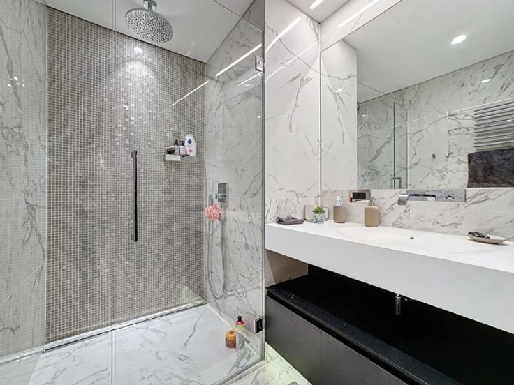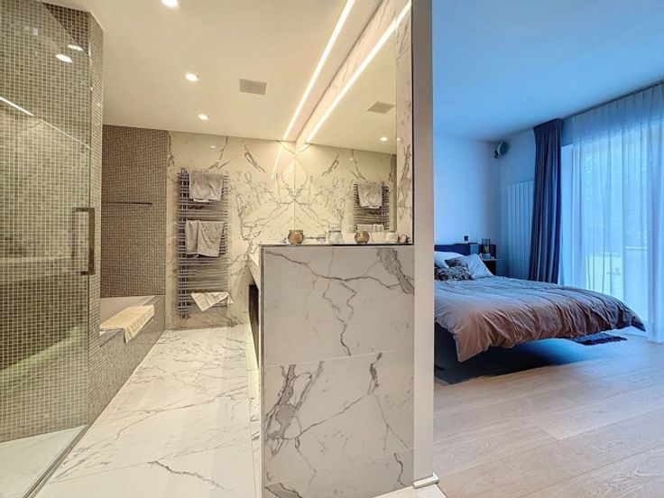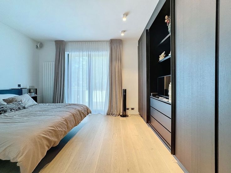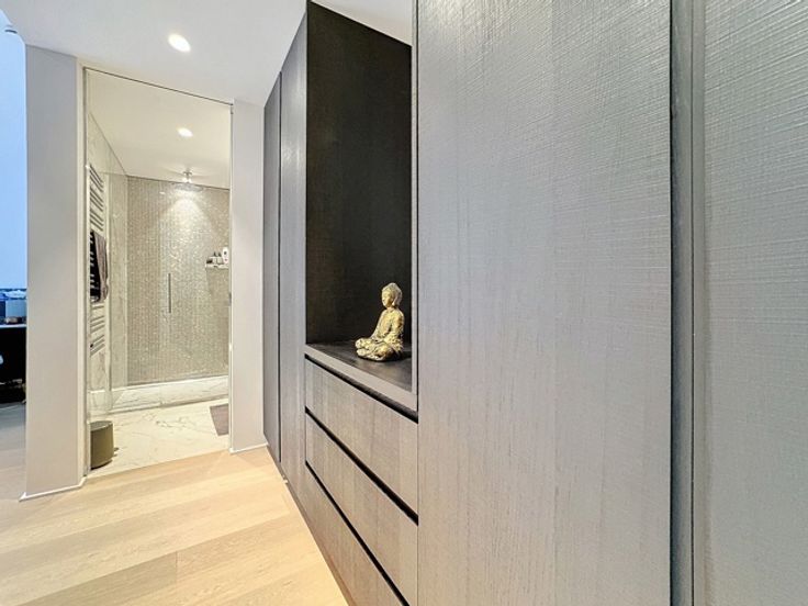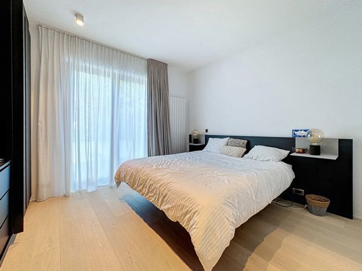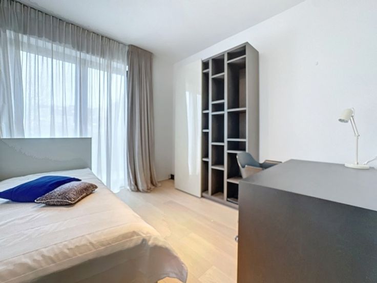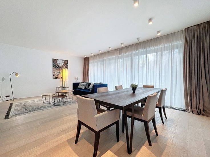 Gelegen in een luxueus gebouw, bestaat deze hedendaagse flat op de 2de verdieping (+/- 156m²) uit: inkomhal, vestiaire, gastentoilet, woonkamer, open keuken (BULTHAUP), terras, hoofdslaapkamer met badkamer en dressing, twee slaapkamers met badkamer, ingerichte bijkeuken. Comfortabele voorzieningen: kelder, fiets- en kinderwagenruimte, afvalruimte, parkeerplaats (tegen betaling). Bedrijfshuur OK.