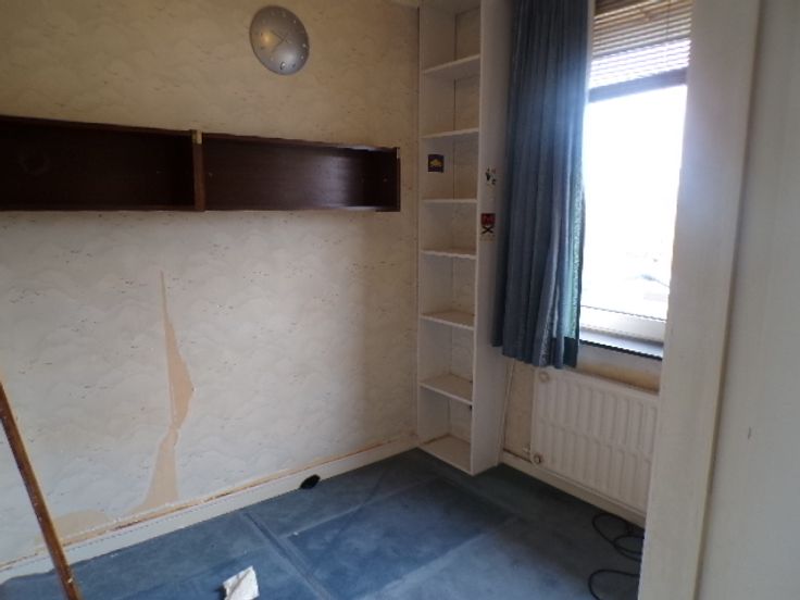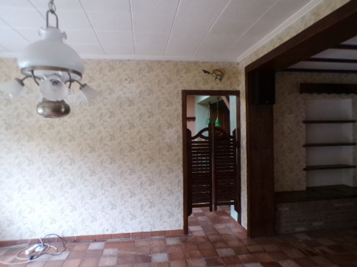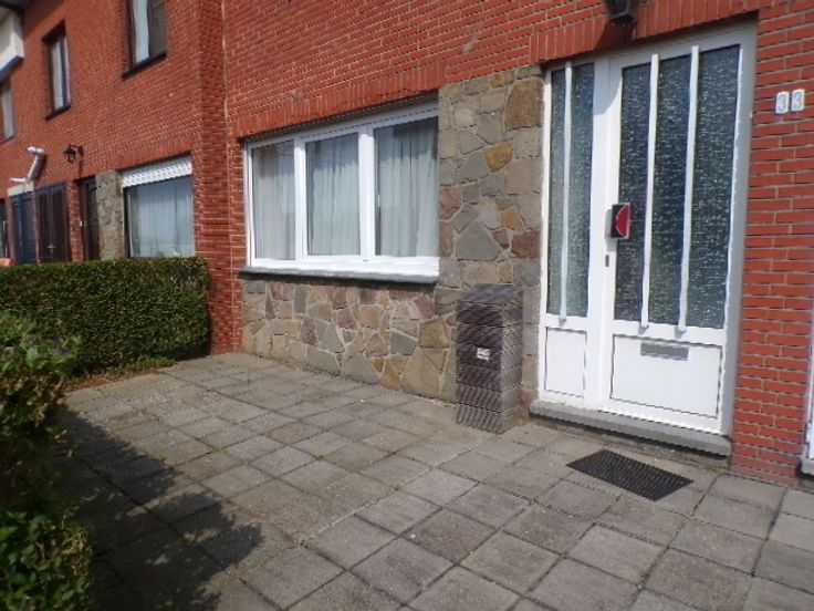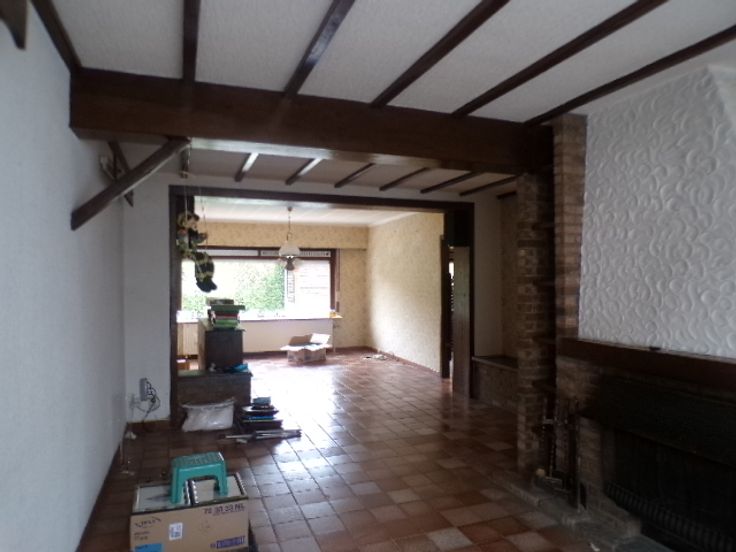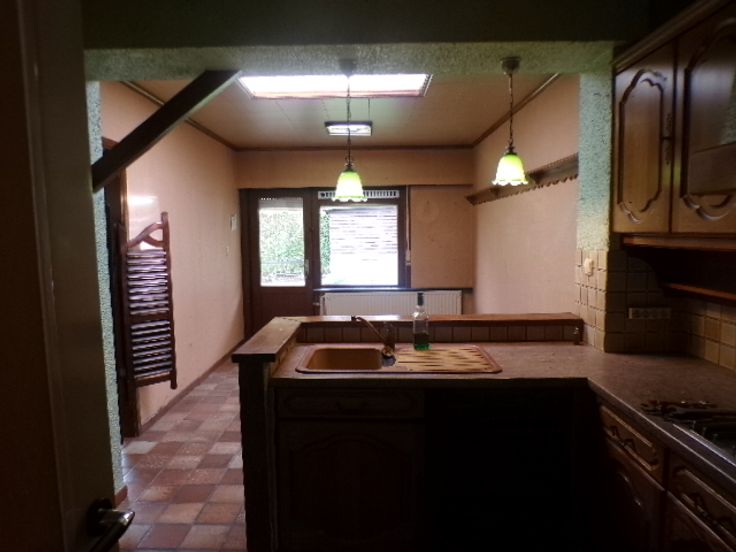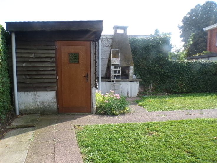 Rez-de-chaussée-> hall d'entrée, un salon et une salle à manger. Une cuisine avec une gaine chaudière et un débarras. Une terrasse avec un beau jardin et un abris de jardin. Le garage est situé à l'arrière du bâtiment avec accès sur la rue voisine.
