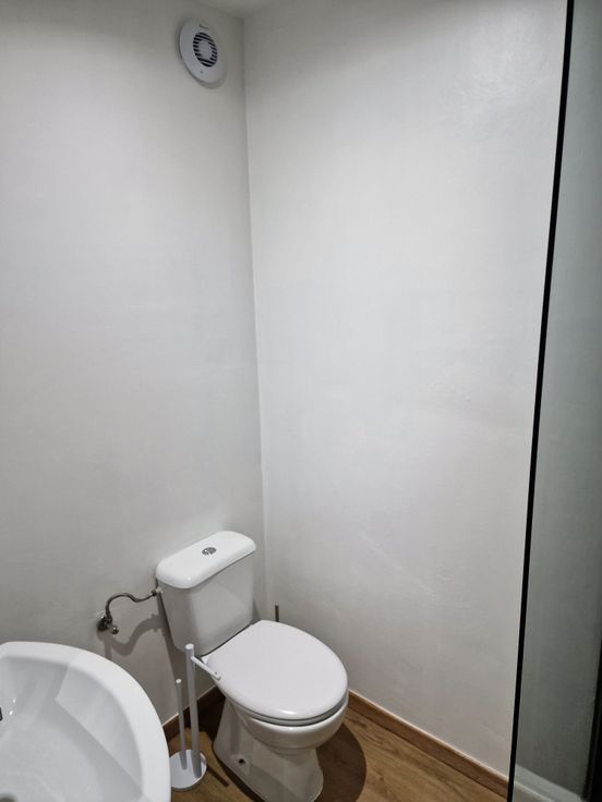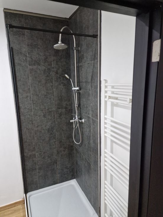 Salle de douche avec WC, meuble évier, sèche serviettes.