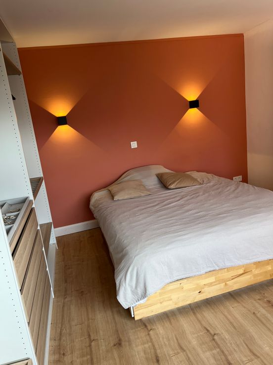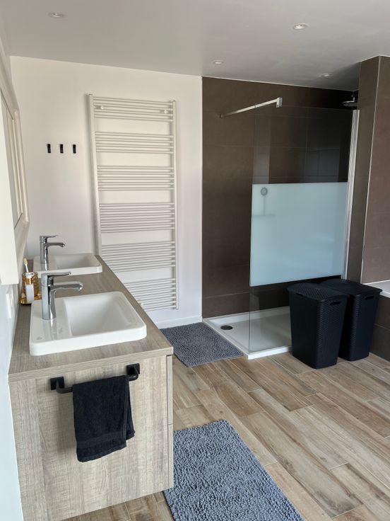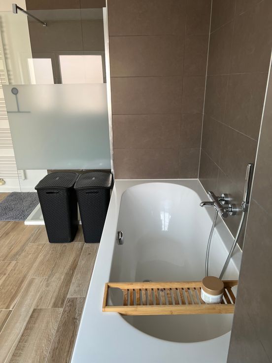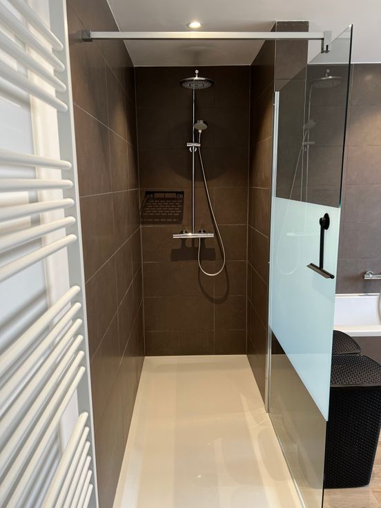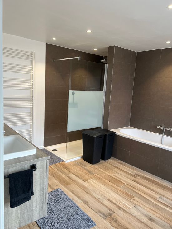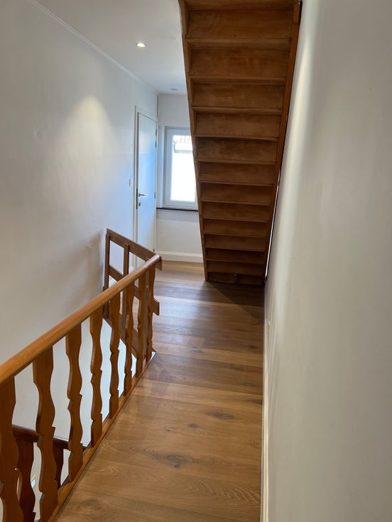 Op de eerste verdieping vind je een ruime slaapkamer, evenals een moderne badkamer die volledig is uitgerust met een inloopdouche, een ligbad en een dubbele lavabo. Alsook bevindt er zich op de eerste verdieping een extra bergruimte met wasmachine aansluiting.