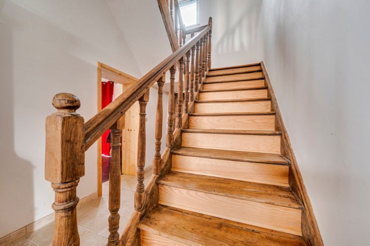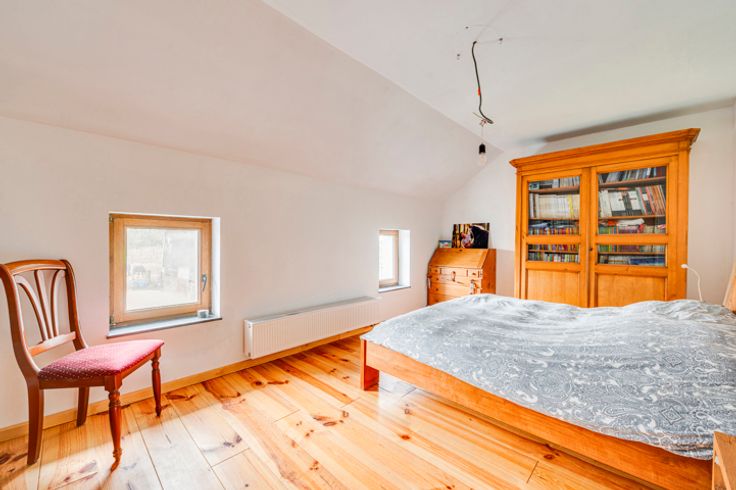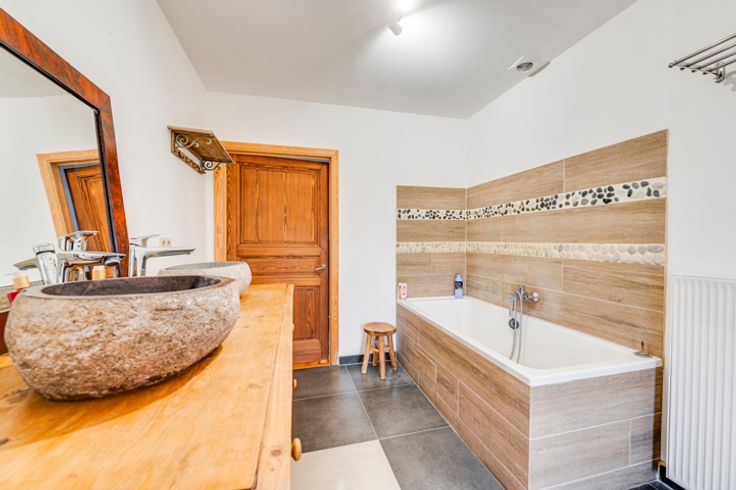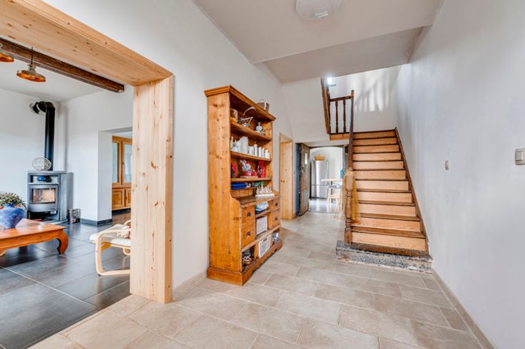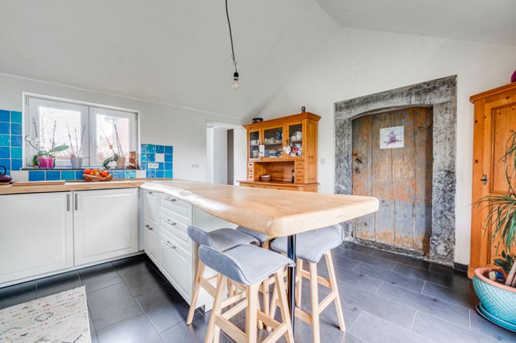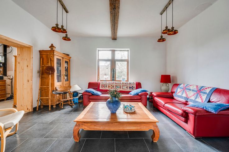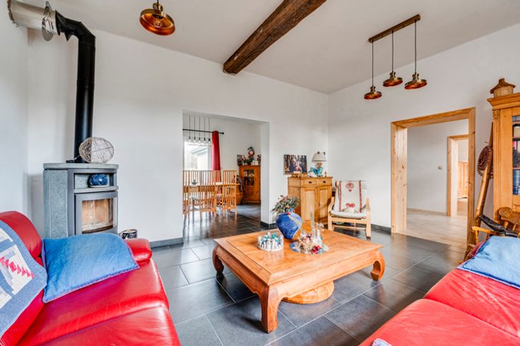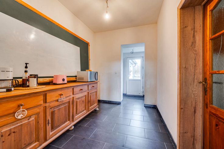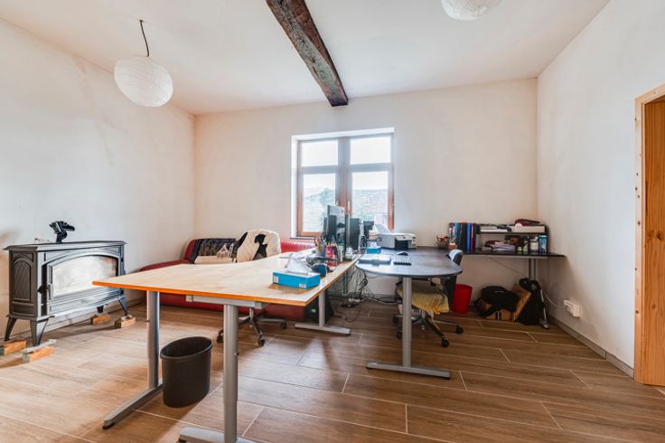 Op de begane grond: hal, woonkamer, kantoor/bonuswoonkamer, ingerichte keuken met massief werkblad (oven, kookplaat, afzuigkap, LV, koelkast), bijkeuken, bijkeuken en toilet. Historische deur en trap, blauwe steen, er is zorg besteed aan het behoud van enkele charmante troeven. In het bijgebouw: verwarming + stal met redelijke plafondhoogte om nieuwe woonkamers (57m²) te creëren, in staat om te communiceren met de vluchtruimte.