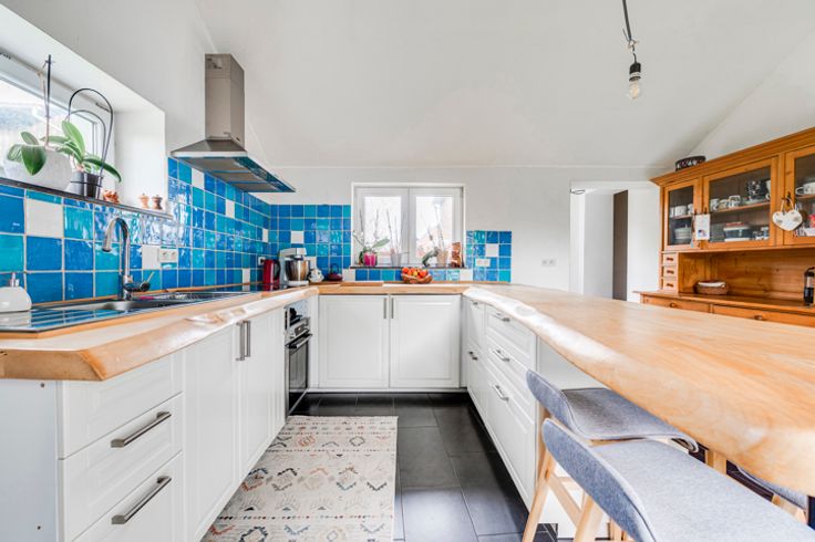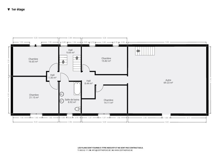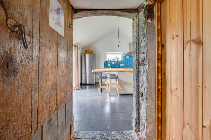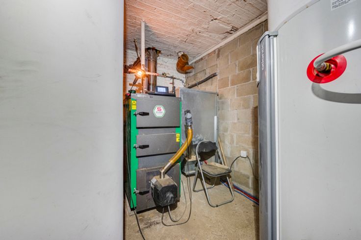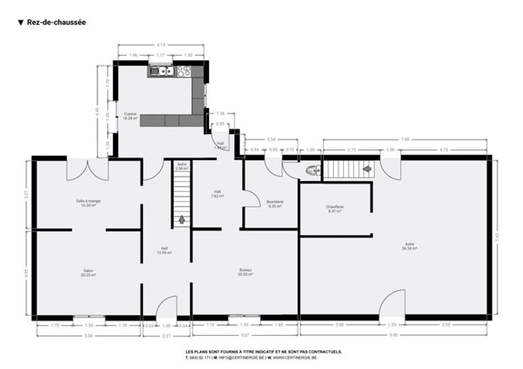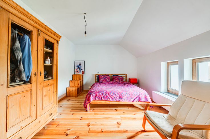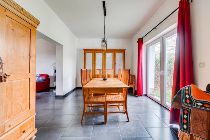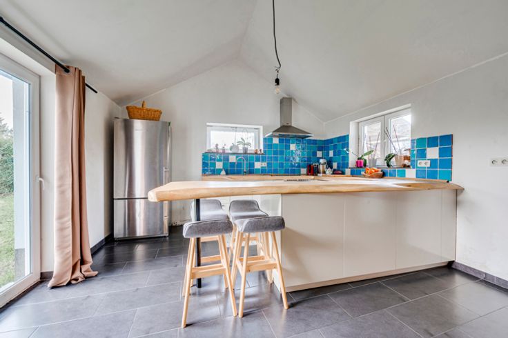 Op de begane grond: hal, woonkamer, kantoor/bonuswoonkamer, ingerichte keuken met massief werkblad (oven, kookplaat, afzuigkap, LV, koelkast), bijkeuken, bijkeuken en toilet. Historische deur en trap, blauwe steen, er is zorg besteed aan het behoud van enkele charmante troeven. In het bijgebouw: verwarming + stal met redelijke plafondhoogte om nieuwe woonkamers (57m²) te creëren, in staat om te communiceren met de vluchtruimte.
