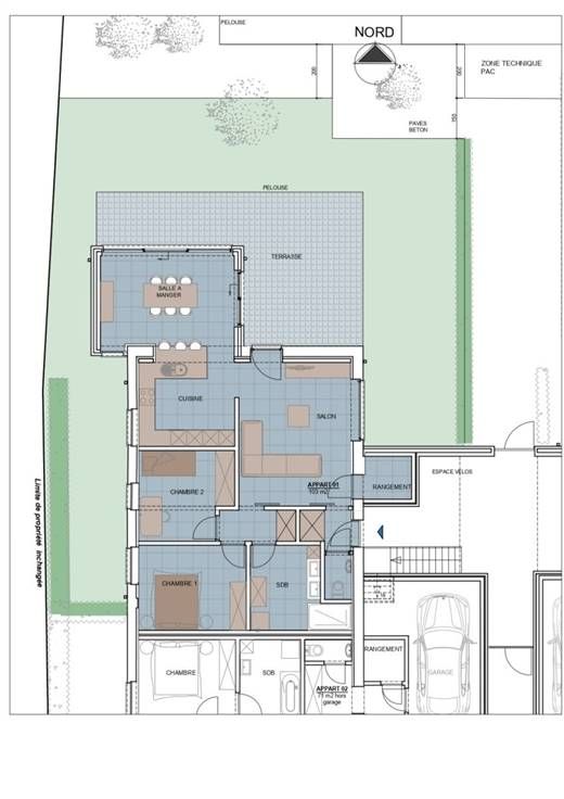 Un appartement de +/- 69 m² (1 chambre ) avec garage, terrasse et jardin de 103 m².