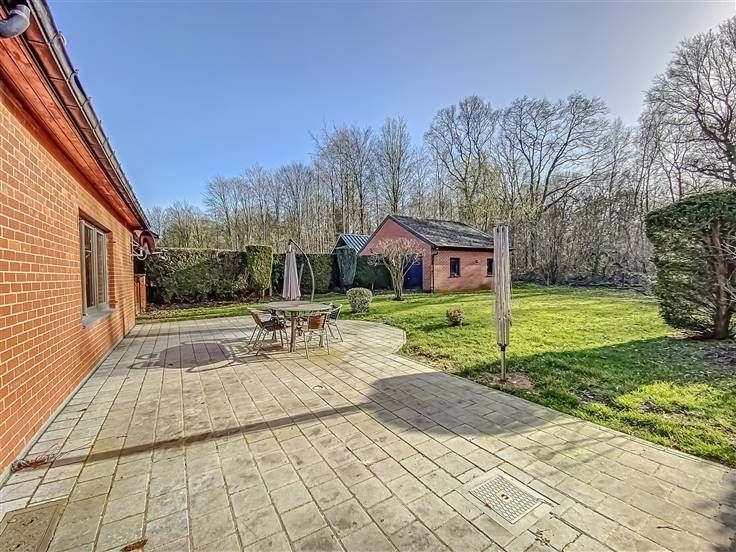 Vaste jardin avec jolie vue sur un environnement boisé.