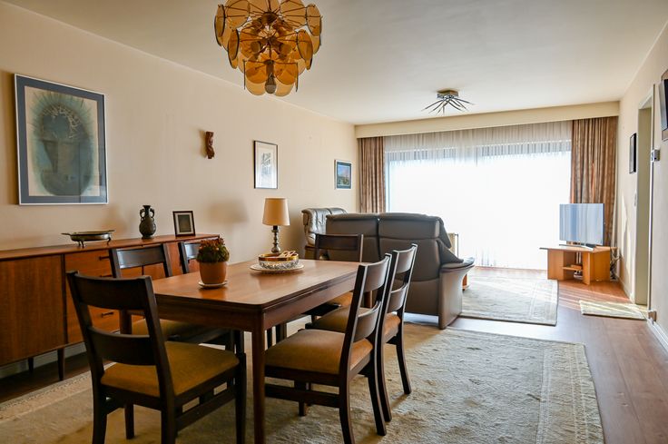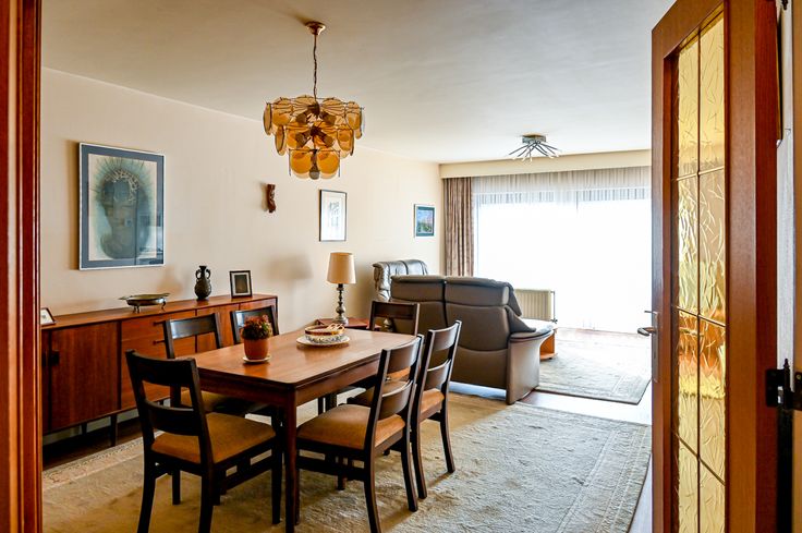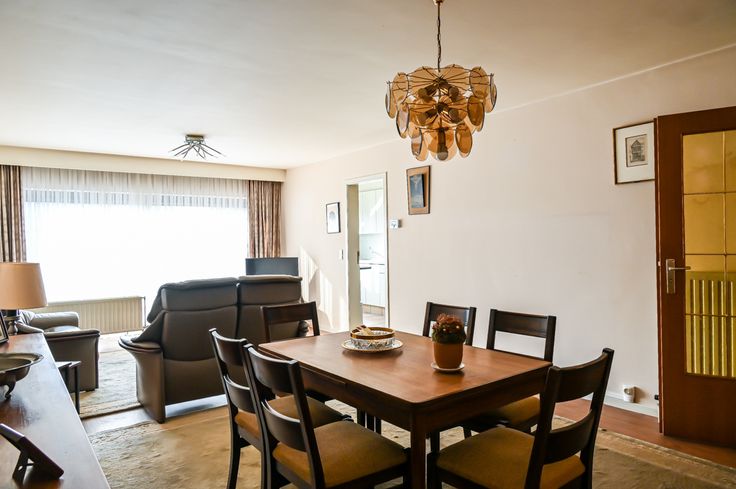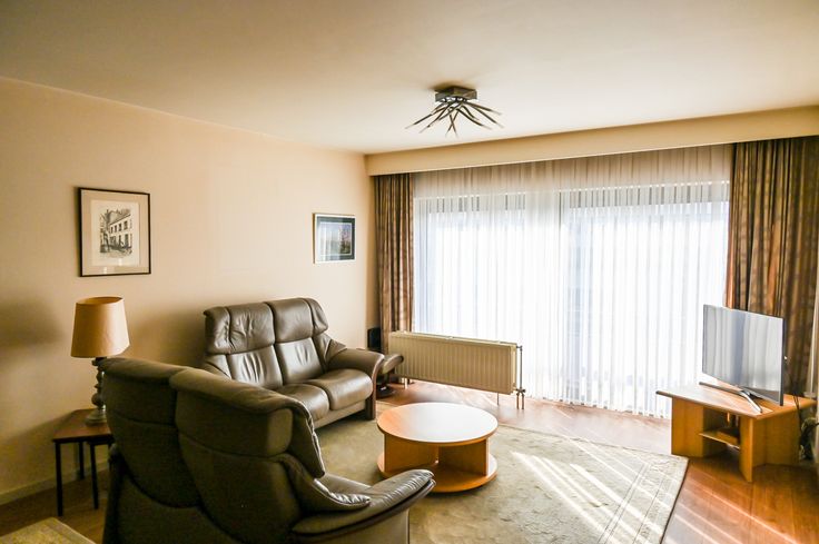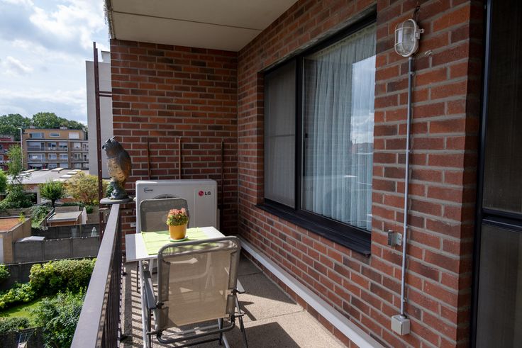 De woonkamer/living (32 m2) baadt in het licht door de grote schuiframen aan de straatzijde, waar over de volledige breedte een klein balkon loopt. De ramen zijn voorzien van zonnewering en voor de warmste dagen van het jaar is er airco voorzien.
