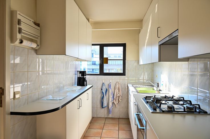 Naast de woonkamer bevindt zich de volledig ingerichte keuken, eveneens aan de straatzijde.