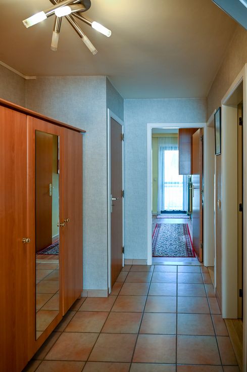De lift brengt je tot op de 3de verdieping. De grote inkomhal biedt ruimte voor een vestiairekast en geeft toegang tot de woonkamer, de 2 slaapkamers, de badkamer, het toilet en de berging.