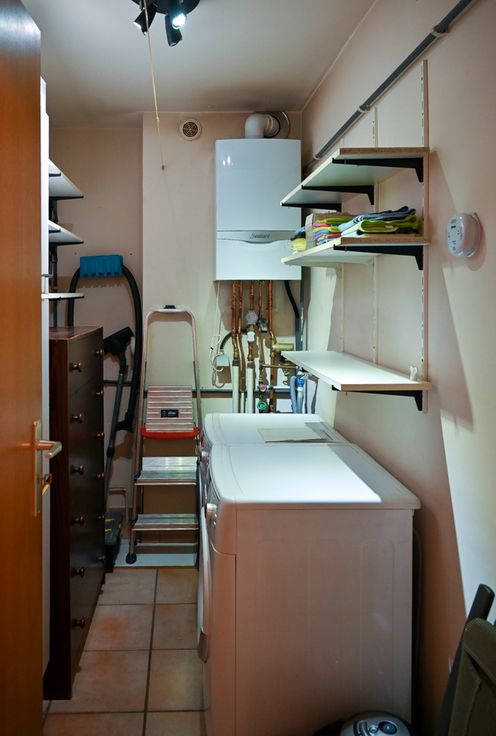 De berging biedt voldoende ruimte voor een wasmachine, droogkast, poetsgerei en andere spullen. Hier hangt ook de condensatieketel voor de cv.