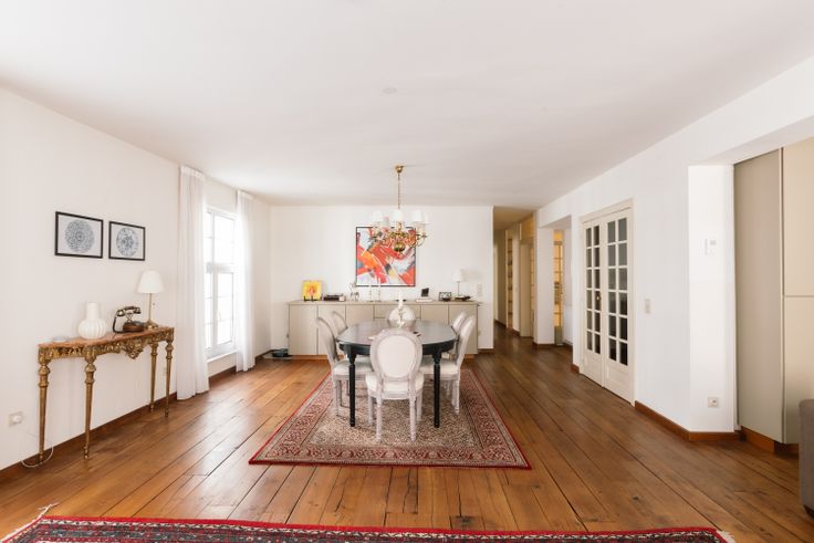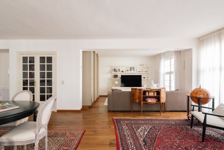 Je komt het appartement binnen via een aparte inkomhal met ingebouwde vestiaire en apart toilet. Via een dubbele deur kom je in de ruime L-vormige woonkamer met eikenhouten vloer en ingebouwde kasten. (TV, dressoir, boekenkast,...)