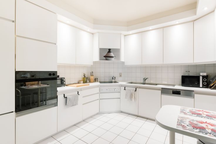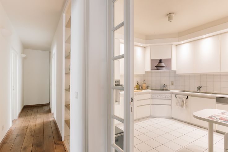 De gang leidt naar de volledig uitgeruste ruime keuken (kookplaat, oven, koelkast, vaatwasser,...) met ingebouwde eettafel.