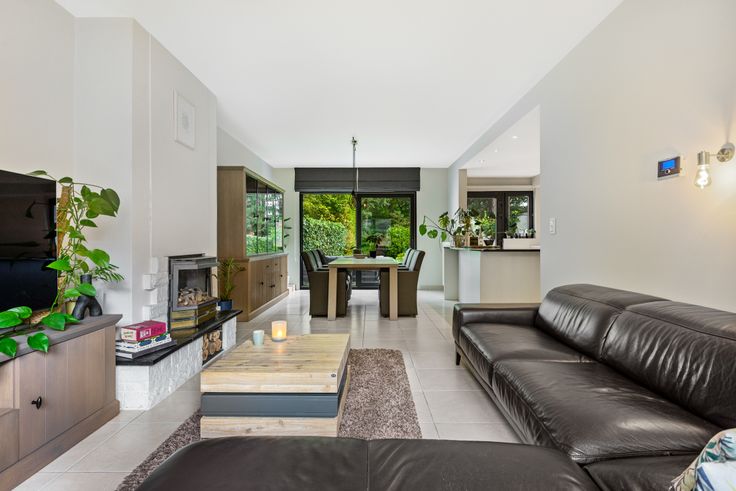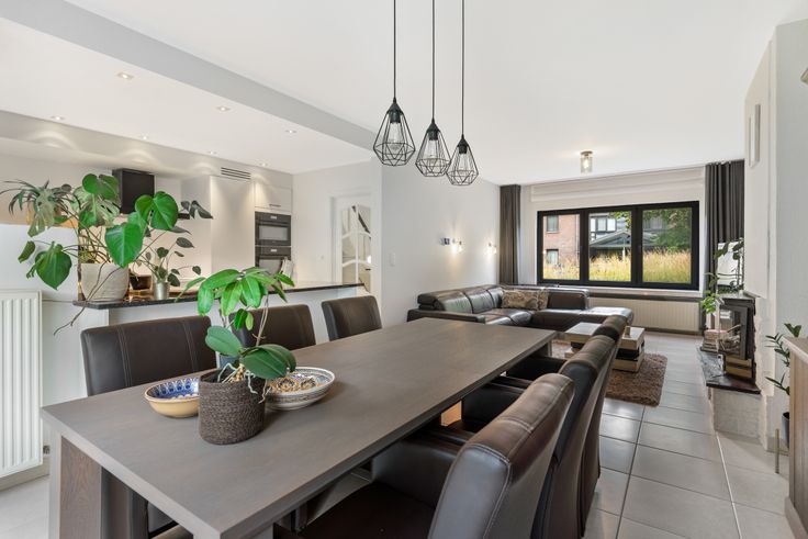 De woning is op het gelijkvloers ingedeeld in een inkomhal met gastentoilet en een open leefruimte met living, keuken en eetkamer, met een mooi zicht op de onderhoudsvriendelijke tuin met aangelegd terras.