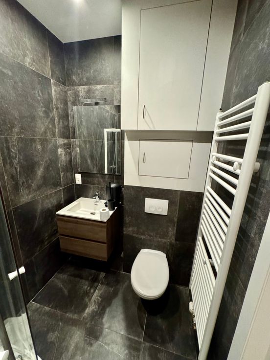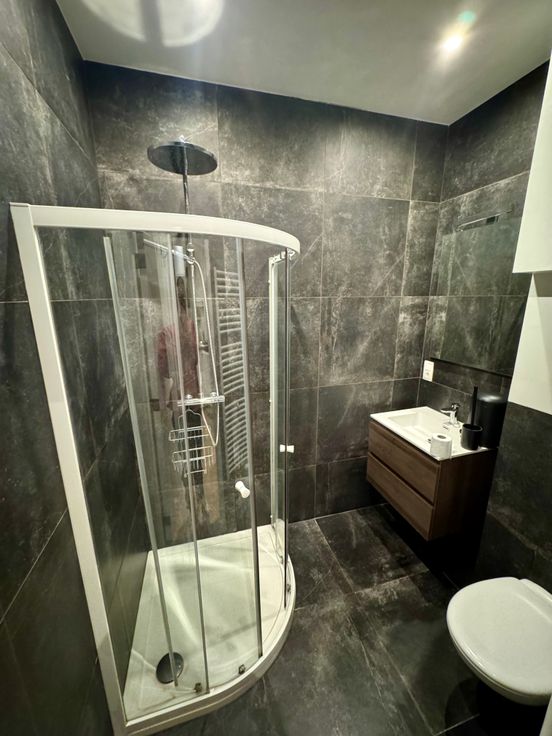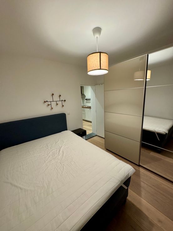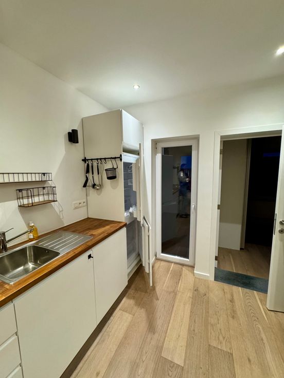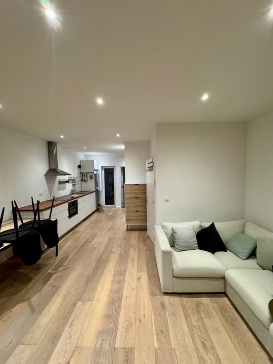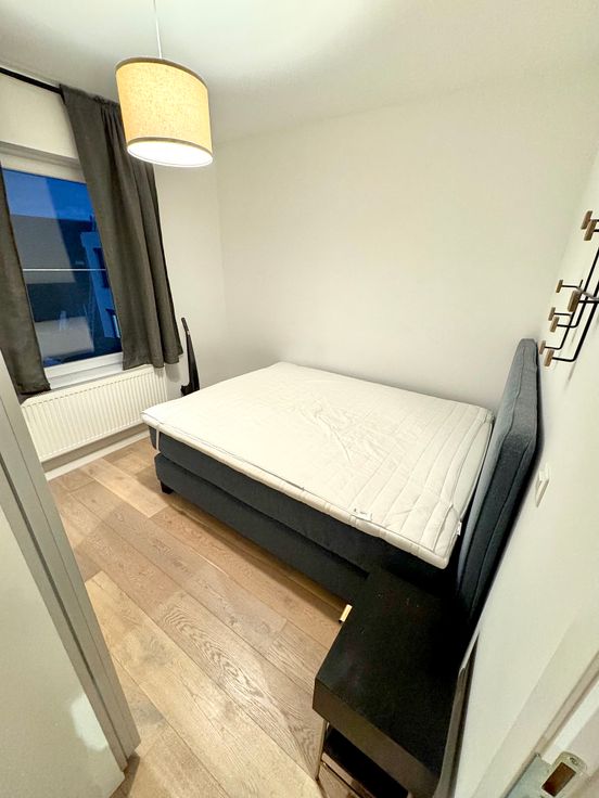 De indeling is praktisch en modern: een lichtrijke woonkamer met een open, volledig uitgeruste keuken, voorzien van een inductiekookplaat, dampkap, koelkast, diepvries, combi-oven, vaatwasser en een praktische ingemaakte kast met aansluiting voor de wasmachine. Verder biedt het appartement een comfortabele slaapkamer en een stijlvolle badkamer met een douche, wastafel en toilet.