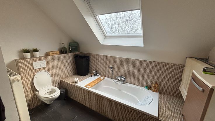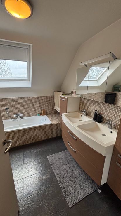 - Badkamer (ca. 9m²) voorzien van een bad, inloopdouche, en dubbele wastafel