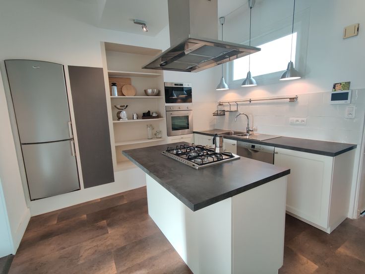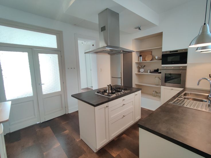 Volledig uitgeruste keuken met natuurlijke lichtinval: gasfornuis, dampkap, oven, microgolf en vaatwasser